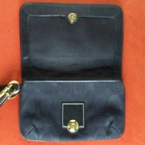 Authentic Coach wristlet with signature jacquard black fabric, black leather trim & cream/white stitching. Holds all the essentials for a night out on the town so you can leave that big bulky bag at home.