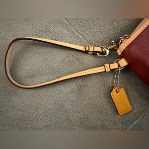 COACH WRISTLET HANDBAG CRIMSON RED F51788 HORSE AND CARRIAGE NEW YORK LOGO ON ONE SIDE ONLY, NEW WITHOUT TAGS, CRISMON RED LEATHER WITH TAN LEATHER TRIM, HANG TAG ALSO IN TAN LEATHER, ONE INTERIOR SIDE POCKET, SATIN POLYESTER LINING, NWOT