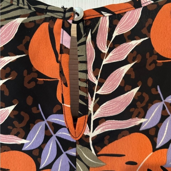 New never worn Chacha Vente multi colored blouse with beautiful leaf design in multiple colors. The color scheme a beautiful blend of colors. The hem and sleeves have overlock stitching. The blouse ties on front. Put to pit is 25”, length is 26” from shoulder to hem.