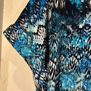 New never worn Cocomo with turquoise flowers, black and white abstract design throughout the blouse. Beautiful blend of turquoise,blue, black and white. Button down front and 2 pockets. A 4” slit on each side at the hem line. A pleat on back very soft knit.
