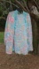 Elegant coverup with pastel leaf design. Features soft pink, blue, and yellow tones. Ideal for beach days.