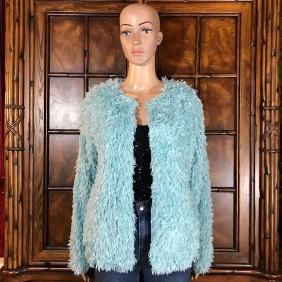 NWOT Colleen Lopez Aqua Faux Feather Jacket