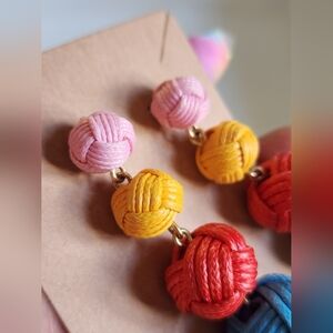 Vibrant drop earrings with woven balls in pink, yellow, red, and blue. Perfect for adding a pop of color.