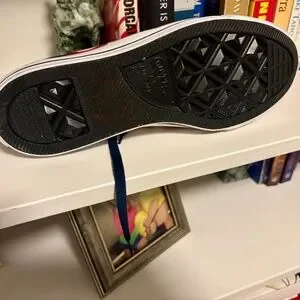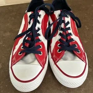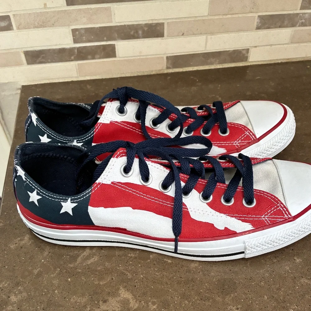 This is a nice pair of Converse Chuck Taylor sneakers size 8.5 Men 10.5 Women. The style is 148835F with the American flag theme in red white and blue and stars. Low top with canvas top and rubber soles.