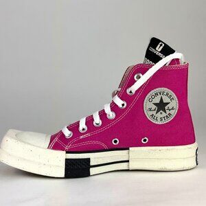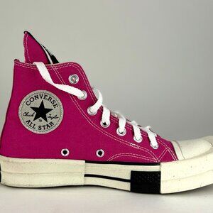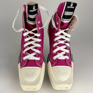 Elevate any sneaker collection with these bold Converse x DRKSHDW TURBODRK Chuck 70 high tops in “Cactus Flower” hot pink. This unique collaboration between Converse and Rick Owens’ DRKSHDW line features a striking square toe, elongated tongue with TURBODRK branding, and double-layered rubber sole for avant-garde edge.