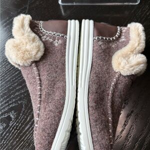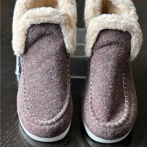 NWOT Comfy moccasin-style slippers with wool-blend uppers and soft faux fur lining. Featuring moccasin whipstitch accents and durable white rubber soles for indoor/outdoor wear. Cozy and practical for everyday use.