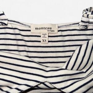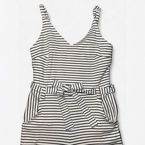 Cream and Navy stretchy striped jumpsuit with adjustable straps, tie belt, and pockets in a flowy cropped leg fit. Size XS. New without tags and perfect condition.