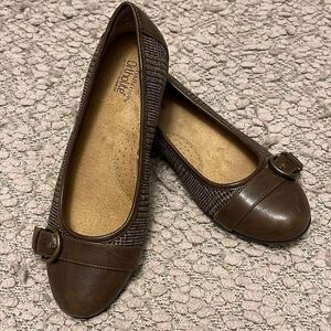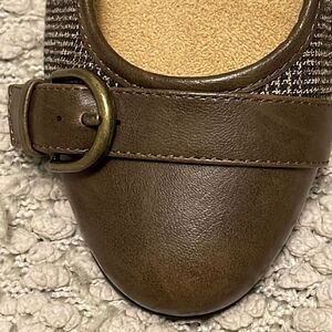Description: Brown plaid ballet flats w/man made upper. Buckle accent. Very comfortable and lite.