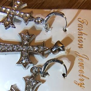 NWOT Crystal 925 Sterling Silver Cross Religious Dangle Earrings & Pendant Set