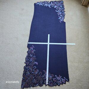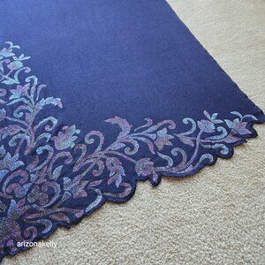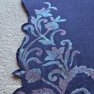 Cashmere scarf from Ahujasons embellished with thousands of sparkling crystals. It's in perfect condition--not a rhinestone out of place, no holes, no snags, no stains, no pet hair, no odor. Where might one wear such a scarf? Sure, you could wear it clubbing, to concerts, or a night out. But why not inject a little flair into your everyday life and wear it to the supermarket, PTA meeting, the dentist, even church? Live a little! The cashmere scarf is surprisingly strong with a diamond weave and reinforced edges.