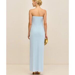 A strapless column gown with signature Cult Gaia gold hardware cutout at the front bust.