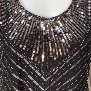 NWOT, but it still has the extra bag of beads attached. Black background with silver thread embroidery and silver sequins. Side zip in a shift dress style. Approx measurements pit to pit 18 length 36 inches.