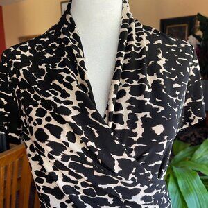 A draped bodice adds presence to a DKNY petite blouse in animal-print matte jersey that works on its own or under a blazer.