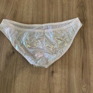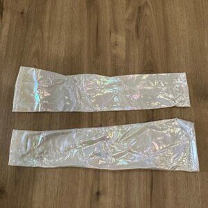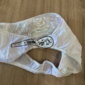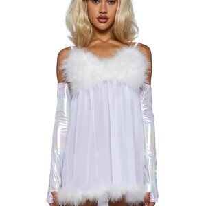 DESCRIPTION: 3-piece costume set that has a sheer nightie dress with feather trim, metallic fingerless gloves, and cheeky panties (unused/unworn) to wear underneath.