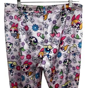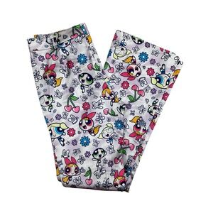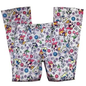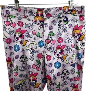 flare pants with all over Powerpuff girls print. Zip fly. Material is polyester. Hand wash.