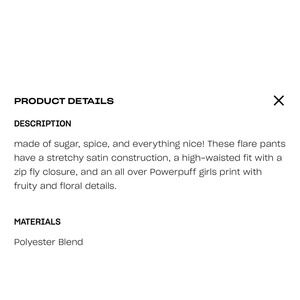 flare pants with all over Powerpuff girls print. Zip fly. Material is polyester. Hand wash.