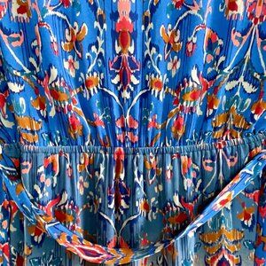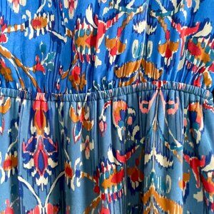 NWOT DR2 Blue Floral Tab Sleeve Tie Waist Midi Dress Lined Bohemian Size Medium