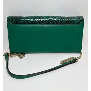 Gorgeous vibrant green snake patterned clutch with a leather/gold chain. Interior is grey satin with pockets for cards and an interior zip pocket. External slip pocket. One small scratch on front from storage, see photos. Measures 10.5” x 6” with a 16” strap drop.