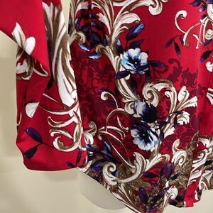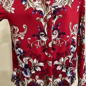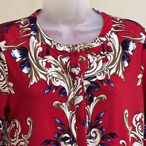 This blouse is satiny soft and super cute. Red with a damask style pattern makes it wearable year round. Wear with a skirt or dress pants for a dressier look. Wear with a cute pair of casual jeans for a more casual look. It is button down so you can leave it open with a cami under it. Very versatile. NWOT