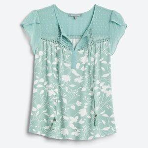 Add a touch of effortless charm to your wardrobe with this Daniel Rainn Jarra Flutter Sleeve Tassel Knit Top in a beautiful turquoise floral print. Featuring delicate flutter sleeves and a boho-inspired tassel tie neckline, this top is perfect for both casual and dressy occasions.
