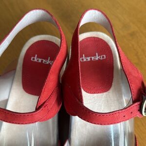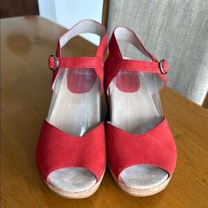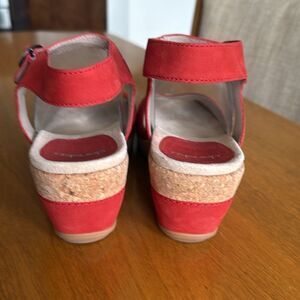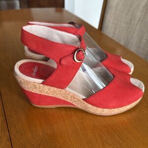 NEW! Tomato red suede wedge sandals with a 3.25” heel.