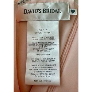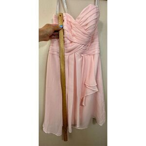 David's Bridal Crinkle Chiffon Dress Strapless mini dress in petal/soft/pale pink with a sweetheart neckline. Fully lined, zippered back with hook/eye closure, ribbed for a lightly structured fit, perfect for a wedding, bridesmaid, prom, graduation, or a special party or event