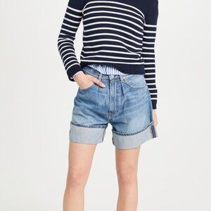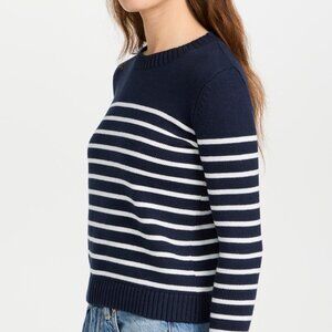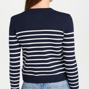 This navy-and-white striped pullover is adorable and beautifully made, but it runs a bit smaller than their sweaters typically do! The fit is slightly cropped, and the stretchy knit is close-fitting and flattering!