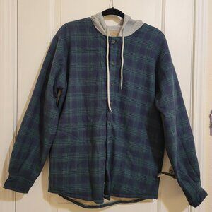 Features: Button, long lined sleeves, 2 deep side pockets, drawstring hood, plaid element outer and fuzzy fleece inside, to provide extra warmth and comfort.
