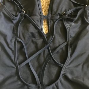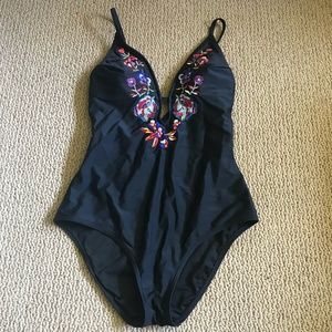 This is a *NWOT* Design Lab Floral Embroidered Swimsuit. There is a deep v-neck in this and low back with crisscross straps. Adjustable straps! One piece swimsuit. Black with flowers Embroidered on the front.