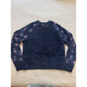 This Desigual sweater features a striking combination of solid blue and floral pink elements, creating a unique visual appeal. The classic crew neck design and ribbed cuffs add a touch of elegance, making it a versatile addition to any wardrobe. Perfect for adding a pop of color to your outfit.