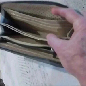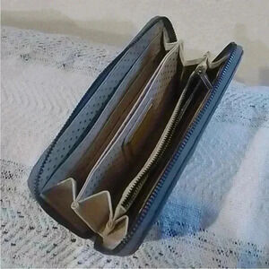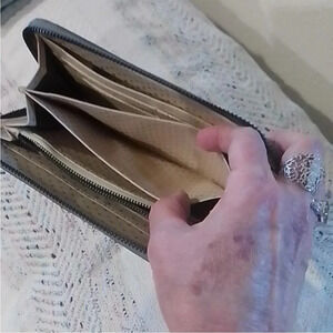 Never used, NWOT Deux Lux Zippered Wallet. Vegan Leather. Dark Grey Metallic look, with brushed nickel look hardware. Very Nice wallet with 3 separate compartments. & credit card slots, 2 long pockets along the inside for receipts or cash. Center zipper coin pocket. Center pocket for cash as well. Very nice, plenty of room.