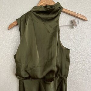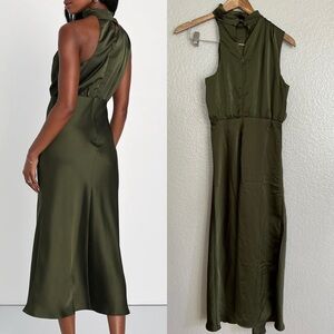NWOT Distinctive Charm Olive Green Satin Asymmetrical Midi Dress