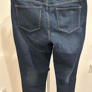 Trendy distressed jeans. Dark wash with stylish rips. Perfect for casual wear.