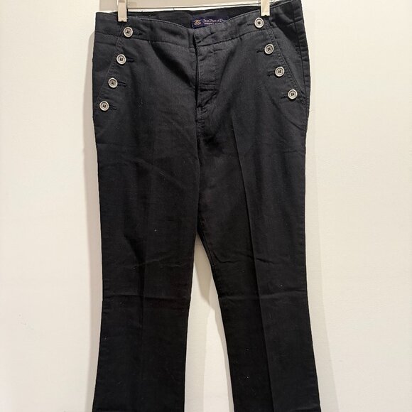 New without tags. Stylish black flared jeans perfect for any occasion. Comfortable fit with a sleek design. Only worn once or twice. The cute buttons down the front pockets and the sleek pleats on the back are the perfect accent to these retro pants!