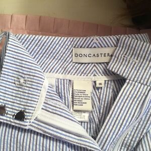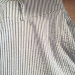Brand New with no tags - Light blue and gray narrow stripes on a white background on these Doncaster Brand seersucker dress shorts. Fiber contents: 97% cotton with 3% spandex. Quality only Doncaster delivers. Hidden zipper, 2 large front side pockets, 2 rear back pockets (haven’t been opened - which means still sewn shut in quality terms) . Now some measurements: waist 38”, hips. 46”, inseam length of 11”