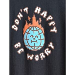 NWOT “Don’t Happy, Be Worry” Graphic Tee – Retro Globe-on-Fire Design – P2P 19″ (Men’s M)