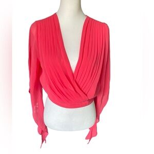 Stunning blouse from Double Zero; size medium. New without tags - never washed or worn. Sheer chiffon fabric is a pretty coral pink color. Pleated babaloo surplice wrap crop blouse has triple button closure at left side hem, open back with single button closure at neck, and butterfly sleeves that taper down and are split at the lower seam. Approximate measurements: