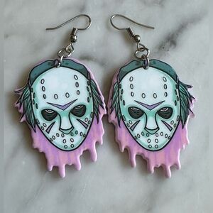 NWOT Double sided art Slasher dangle earrings 80’s horror pink and grey
