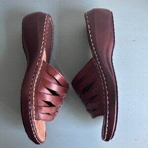 These slip-on sandals feature a mid heel height, making them suitable for everyday wear. The leather upper material adds durability and a touch of sophistication to the slip-on style, perfect for casual outings or summer activities.