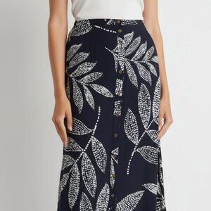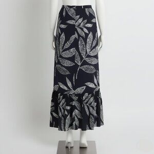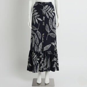 DR2 by Daniel Rainn maxi skirt, navy skirt, white leaf print, button down skirt, elastic waist skirt, boho maxi skirt, flowy skirt, summer skirt, vacation skirt, beach skirt, casual maxi skirt, Daniel Rainn skirt small, long skirt