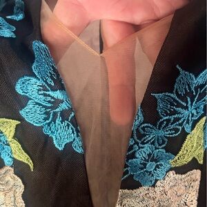 NWOT- Dress the Population- Beautiful embroidered Sample Dress. Size S. Sheer deep V and sleeves. Fully lined bodice and skirt. Hidden back zipper.