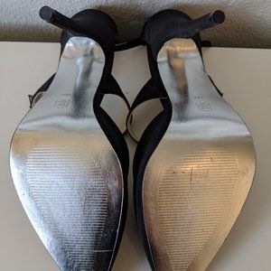 Hobnob with the celebrities! Or feel like you are with these "E Live From The Red Carpet" heels! Beautiful black satiny shoe with an elegant double strap featuring silver buckles with crystal inlay. So flash a little of that leg and gorgeous silver sole- a star is born!