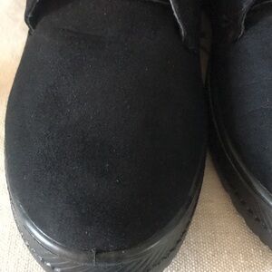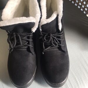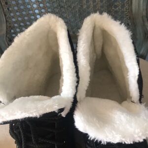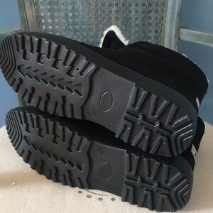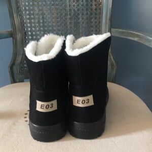 NWOT E03 Black faux suede lace up combat boots. Faux white fur interior. Very lightweight.
