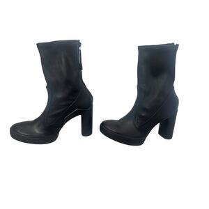 This is a pair of ECCO Shape Sculpted Motion 75 platform boots in black, size 39 (US 9-9.5). The boots feature a round toe, mid-calf shaft style, high block heel, and a leather upper. Suitable for parties, casual wear, and themed with a rock or city vibe from the 90's. The brand is ECCO, and the style is a platform boot with a round toe and mid-calf shaft.