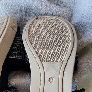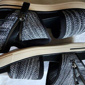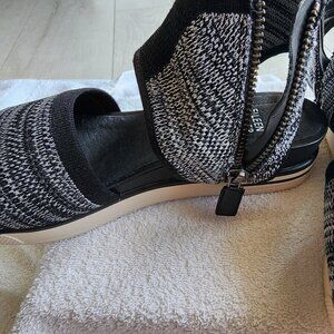 NWOT EILEEN FISHER STRETCHY FABRIC BLACK/WHITE KNIT DESIGN SPORTY SANDALS WITH FLEXIBLE RUBBER SOLES FOR GOOD GRIP AND NO BREAKIN NEEDED. SANDALS ZIP NEAR ANKLE/INNER FOOT AREA. SECURE FOOTING WELL MADE EILEEN FISHER SANDALS, NEVER WORN OUTSIDE BUT ON WOOD FLOORS TO TRY ON. CLEANING OUT MY CLOSET, YOU WIN. WOMENS SIZE 7M. PLEASE NO LOWBALL OFFERS, FINAL SALE, ASK ANY QUESTIONS, SHIP OUT ASAP DURING WEEKDAYS AND ON NEXT BUSINESS DAY ON WKENDS. CLEANING OUT CLOSET, NEVER ENDED UP WEARING, SO YOU WIN ON A GREAT QUALITY SANDALS THAT WON'T HURT YOUR FEET AND YOU CAN GET YOUR 10K STEPS IN! SMOKE-FREE/PET-FREE HOME.