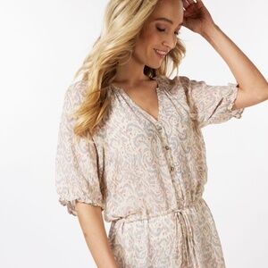 A light, airy dress with a subtle paisley pattern. The dress has a v-neckline to button down and short, loose sleeves, giving it a relaxed and casual look. It is cinched at the waist with a tie, which includes a small decorative tassel. The skirt of the dress is knee-length and has a slight ruffle at the hem, adding a feminine touch. ,I have a size 6, 8, 12.