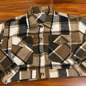 EditHer Stylish Flannel plaid button-up cropped jacket with chest pockets. Features a mix of black, white, and brown colors. Size XL 80% cotton 20% polyester New without tags