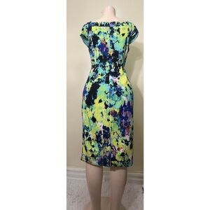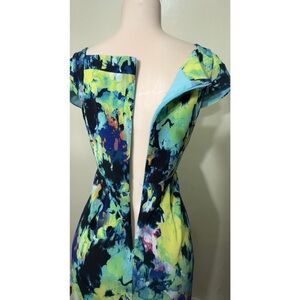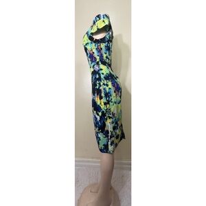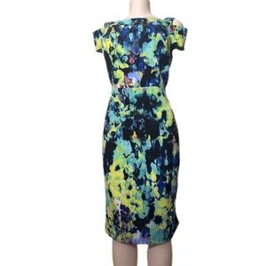 Step out in style with this elegant abstract print midi dress. Featuring a stunning blend of blue and yellow hues, this dress is perfect for any occasion.
