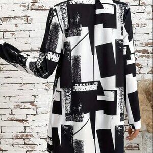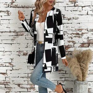 Step into timeless sophistication with this black and white geometric print jacket, tailored for both casual and formal occasions. Featuring a structured mid-length silhouette, crew neckline, and long sleeves, this piece blends modern minimalism with bold patterning. Made from a lightweight polyester blend, it’s the perfect transitional layer for fall weather.