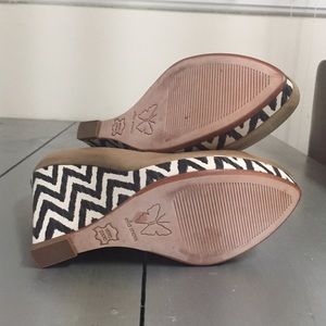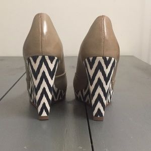 NWOT. Tried on in house and store, but never worn! Ella Moss tan leather platform wedge pumps with black and white zig zag fabric heel. Leather insole and sole. 4.25" heel and .75" platform. Inside of right shoe has outline of where the price tag sticker was located.